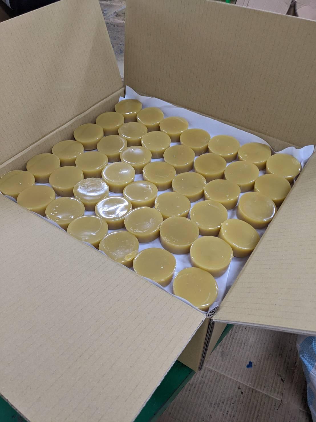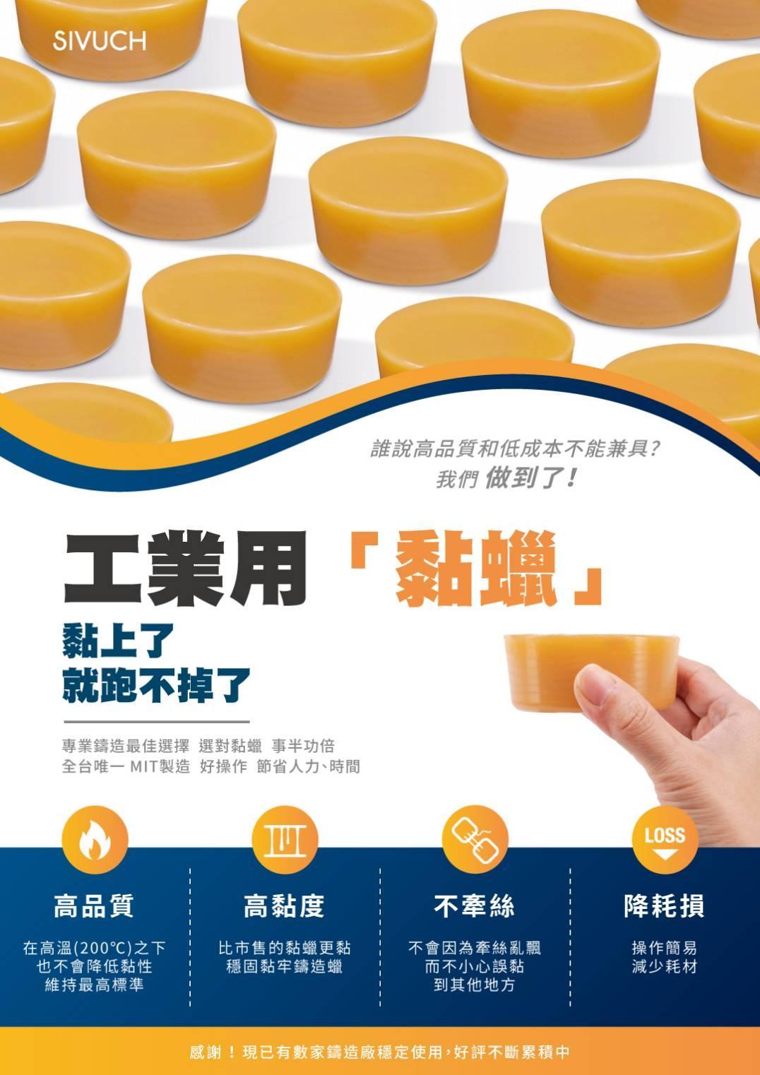 擁有高強度黏性 用於蠟與蠟的物件之間的黏接 熔點約70~100度 操作溫度:150~200度,依氣溫條件及操作習慣調整 顏色: 淺黃 重量: 約100克/顆 包裝: 25KG/箱 (252顆)