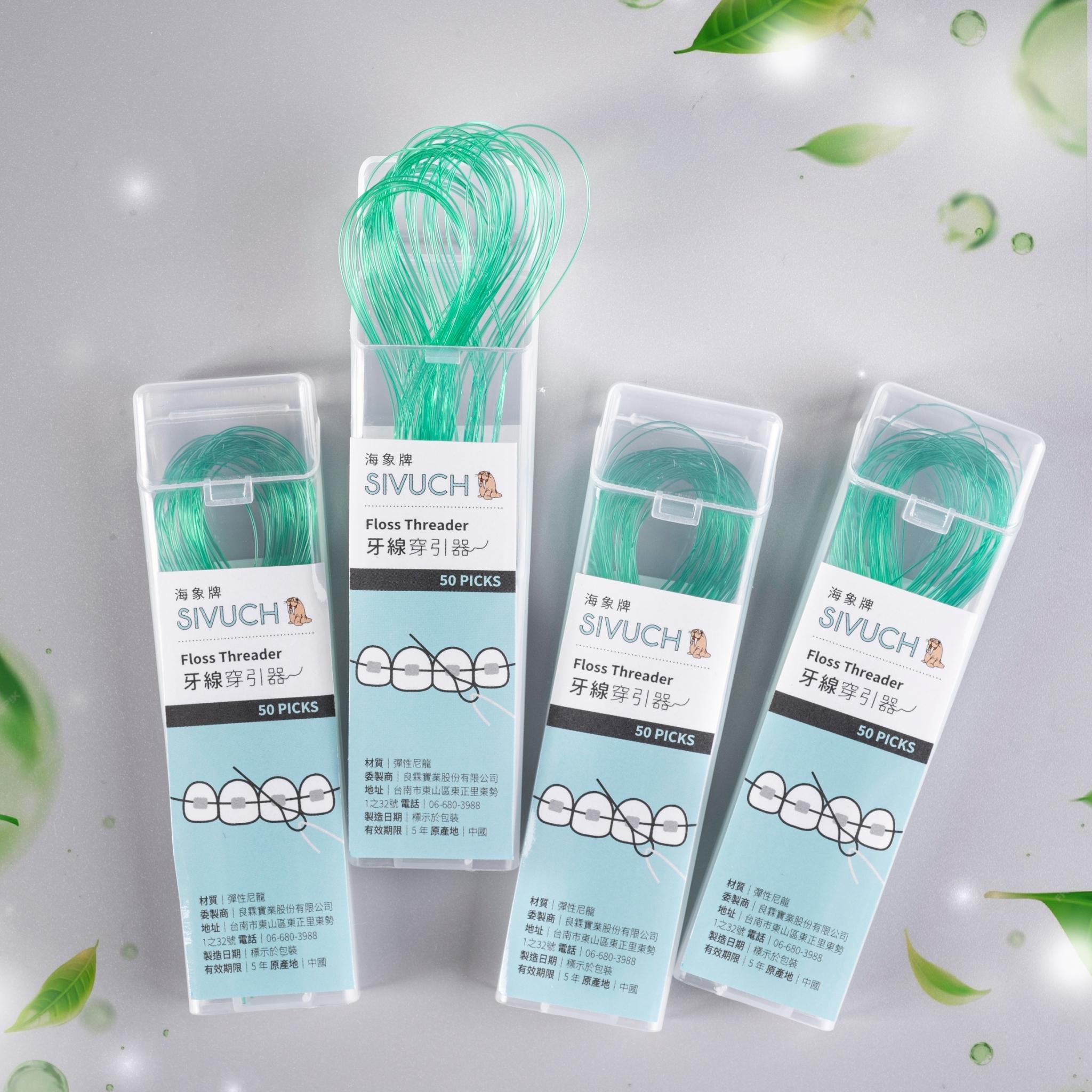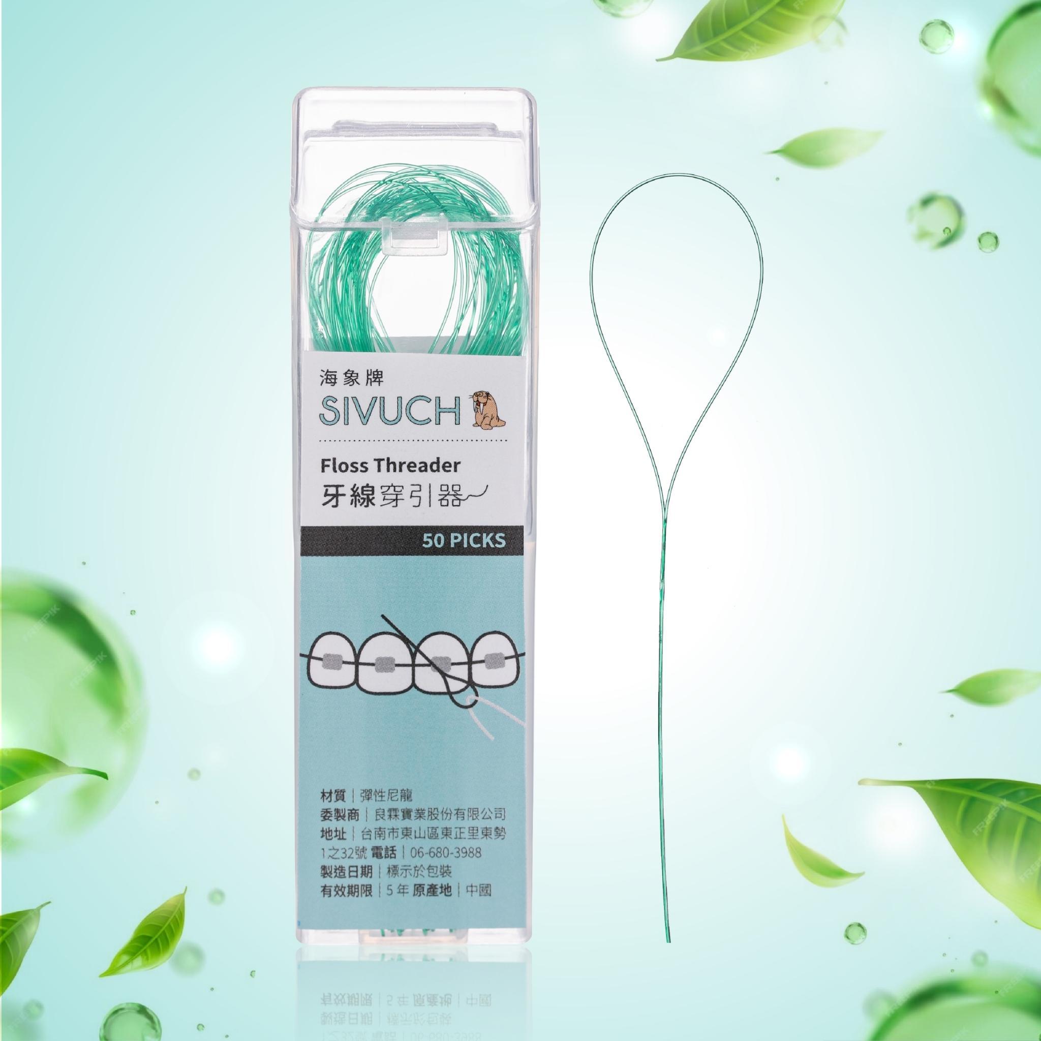 SIVUCH海象牌 牙線穿引器 材質: 彈性尼龍 顏色: 青蘋果綠 數量: 一盒50條 使用步驟: ① 取一條牙線穿過牙線穿引器的圈圈。 ②將連同牙線的牙線穿引器的尾端穿過牙縫。 ③將牙線穿引器取出,即可開始使用牙線。